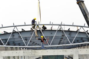 记者现场看到,工人们早上6时就已开工作业,他们有的焊接,有的搭钢架,有的装卸建材,工地上一派繁忙的景象。据介绍,该车辆段工程高峰期施工现场人数达2500余人。目前,车辆段围护结构已全部完成,土方开挖也已100%完成,全部主体结构已完成90.3%。