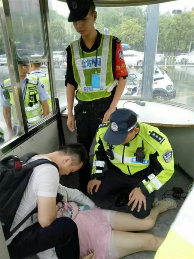 女乘客摔倒的位置正处于出租车专用行车道上,车辆出入频繁,十分危险,并且下着大雨,不利于现场施救。杻纽中心保安员立即行动起来,在征求女乘客亲属同意后,将女乘客紧急转移至值勤岗亭内。