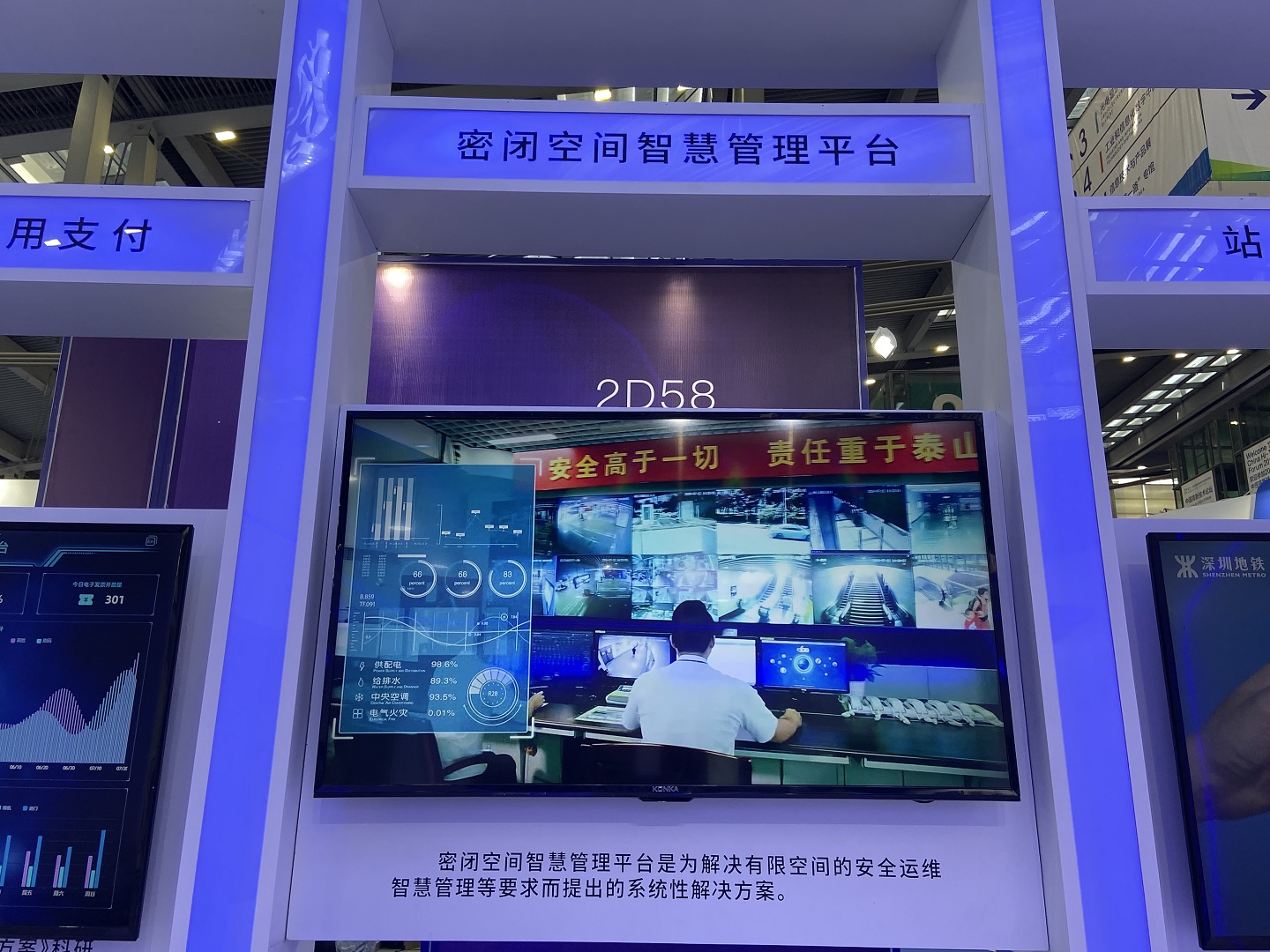 深圳地铁集团携各分子公司参加展会,ONEPay 物业本次参展的项目是《密闭空间智慧管理平台》。密闭空间智慧管理平台是综合利用互联网+、云计算、大数据、物联网、人工智能等技术手段为实现有限空间安全运维、智慧管理等创新管理要求而提出的系统性解决方案。