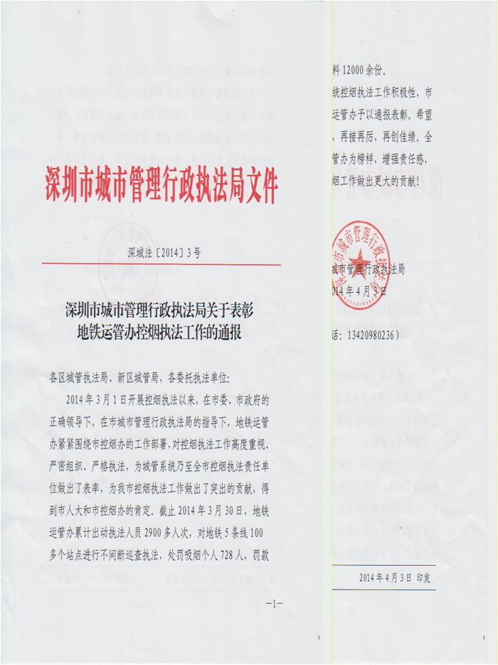 截止至2014年3月30日,运管办累计出动执法人员2900多人次,对地铁5条线100多个站点进行不间断巡查执法,处罚吸烟个人728人,罚款金额36400元,发放控烟宣传资料12000余份。在城管系统乃至全市控烟执法责任单位做出了表率,为深圳市控烟执法工作做出了积极贡献,得到市人大和市控烟办的充分肯定,并于4月3日,市城管局以正式文件在全市范围内予以通报表彰。运管办广大干部和执法队员有决心,在今后的控烟工作中发扬成绩,戒骄戒躁,再接再厉,再创佳绩,为全市控烟工作继续做出更大贡献。