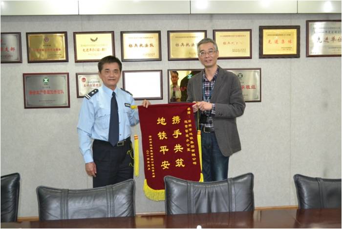2014年3月21日晚,罗宝线机场东站上行线列车尾部车厢错出轨道,由于保安员赵明江及时发现和迅速反应,将事故影响降到最低。运管办一号线大队执法队员按照要求时间迅速集结赶到地铁机场东、后瑞、固戍站,配合车站工作人员对乘客进行限流疏导,保证了三个车站现场良好的秩序。此次执法队员和保安员的积极应对突发事件的表现得到了运营总部的高度评价。25日,运营总部陈琪副总经理代表运营总部送来“携手共筑,地铁平安”的锦旗,对我办表示感谢。