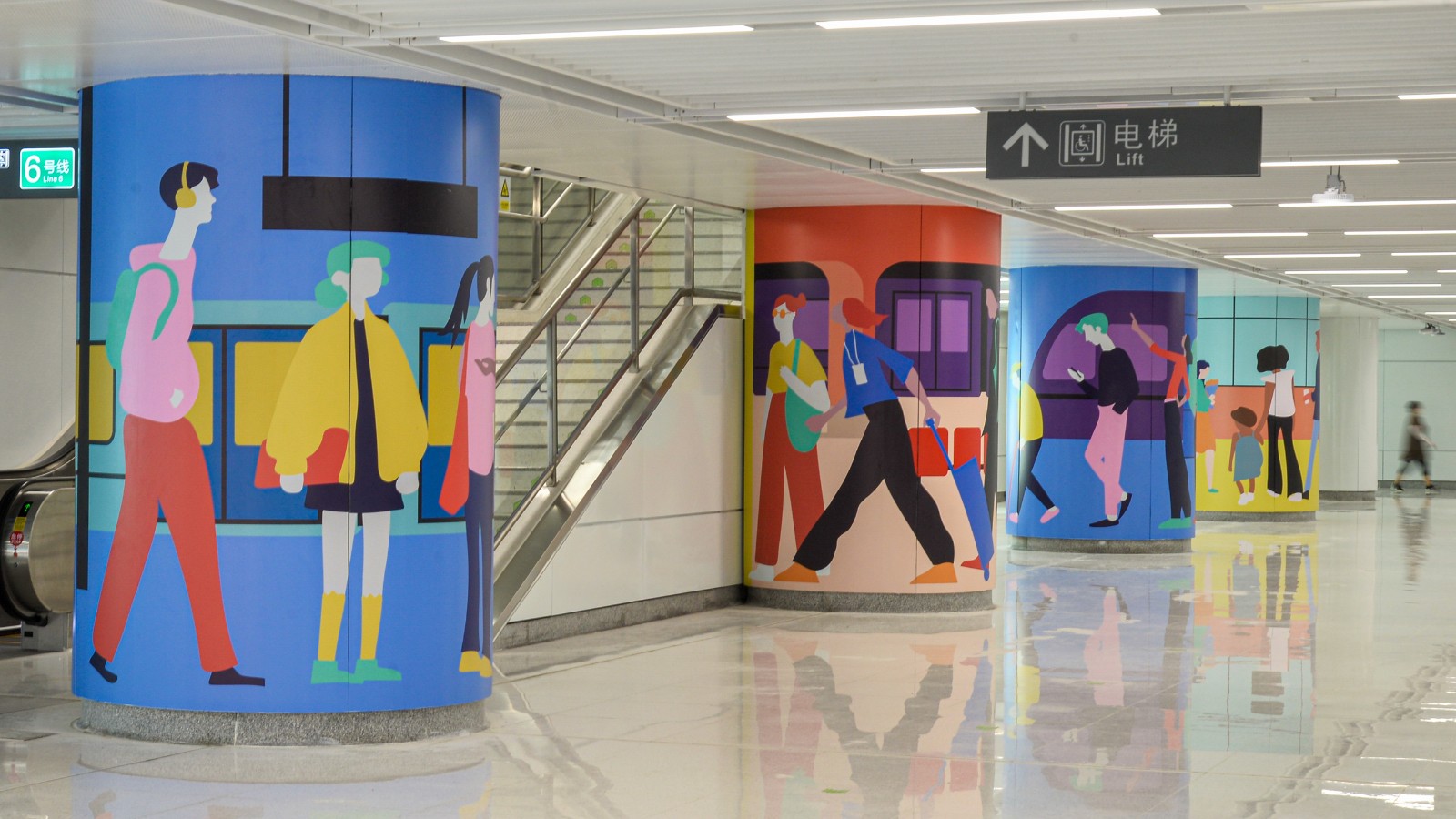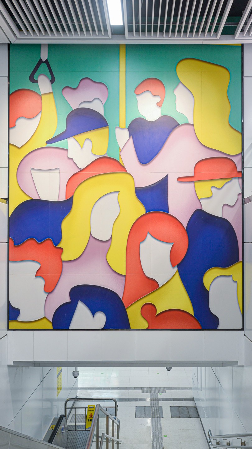 公明广场站《都市剪影》 艺术家:OUTTA艺术小组作品说明:人物风格设计采用简约的线条和明快的色块搭配,通过饱和度和鲜明的颜色更能在视觉上引人注目,使人心情愉悦,生动展现都市人快节奏忙碌的生活姿态。角色里包含形形色色不同行业和年龄的人,有老人小孩、有靓仔美女等等,但整体视觉是活泼和生动有朝气的,和深圳年轻有活力的气质相符,让人们在地铁行走时感受到自己也是城市风景的一部分,共同创造地铁景观。