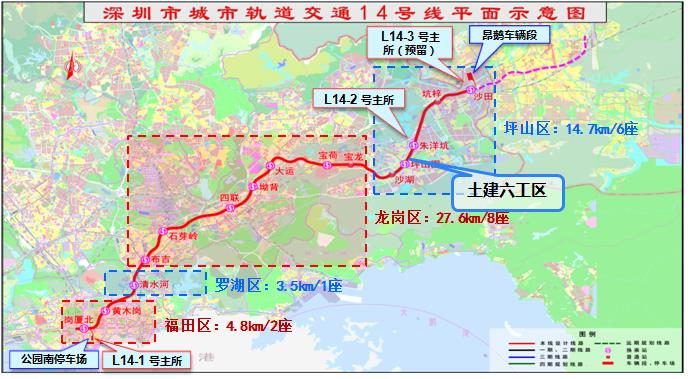 深圳市城市轨道交通14号线工程起自福田中心区岗厦北枢纽,经罗湖区、龙岗区止至坪山区(DK0+000~DK50+343),线路主要沿深南大道、华富路、泥岗西路、清水河五路、龙岗大道、中兴路、东西干道、盛宝路、红棉路、龙岗大道、如意路、宝荷路、宝龙大道、坪山大道、深汕公路敷设至沙田,线路全长50.343km。全部采用地下线敷设方式,本线设计时速120km/h,共设站17座、停车场1座、车辆段1座、主变电所4座。