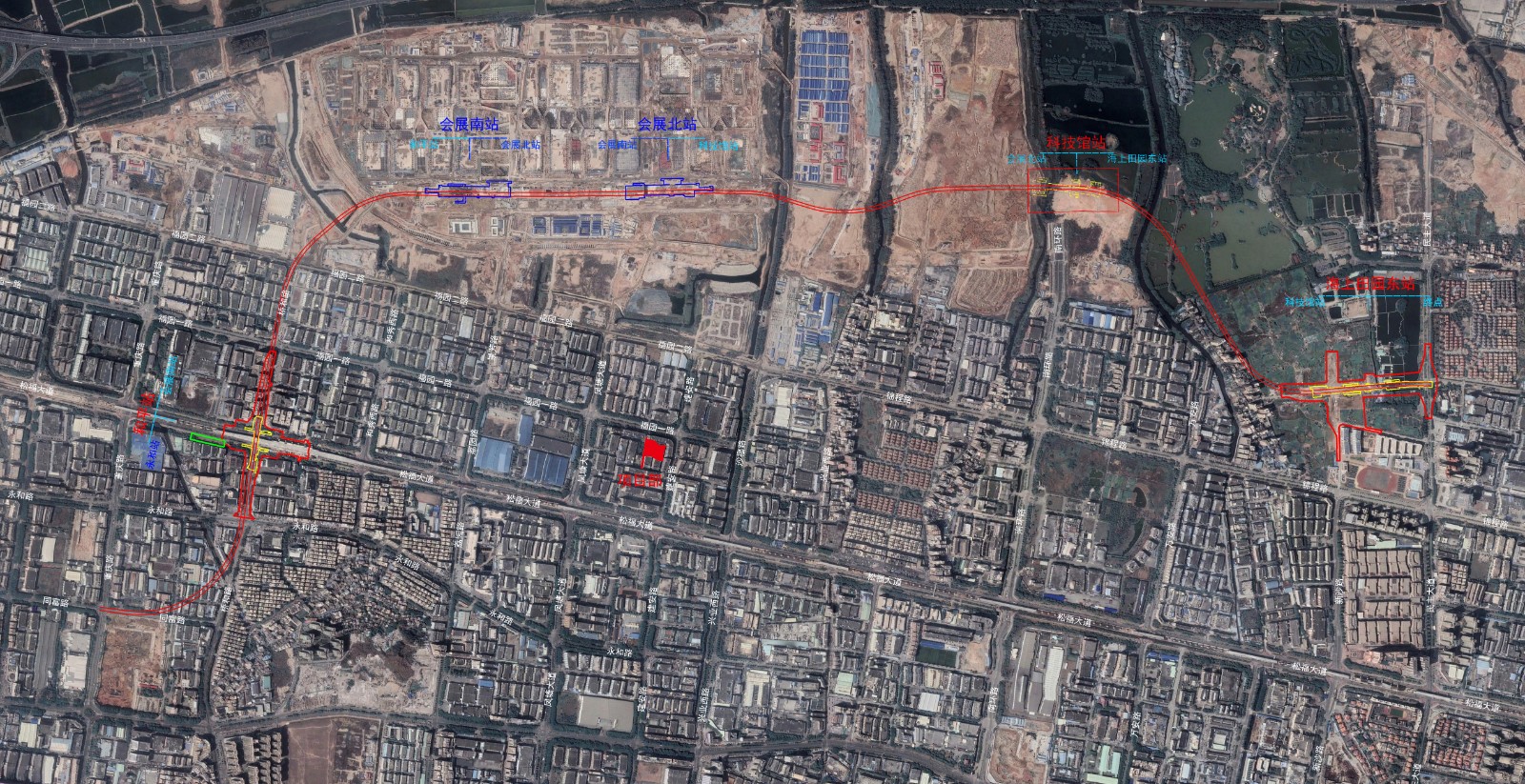 会展南站是深圳地铁12号线工程的第26座车站,车站为标准岛式两层车站,车站为深圳国际会展中心配套市政项目和规划20号线的换乘车站,采用双岛四线平行敷设方式,通过站厅换乘。车站附属包括A、B、C1、C2、D号出入口,1#、2#、3#风亭组, 1#、2#、3#安全疏散楼梯间,冷却塔,其中车站东侧附属为会展招华代建。