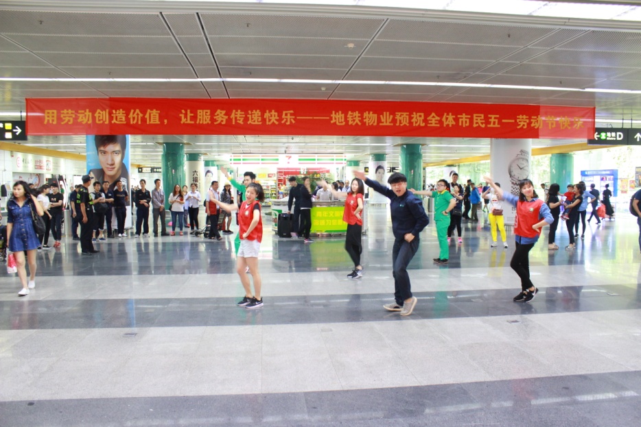 虽然快闪表演只有短短的几分钟,但是艺术团成功地把地铁物业人青春健康的生活态度带到了东站、罗湖、福田、北站,将地铁物业人用心服务的工作理念传播给深圳的广大市民,让大家一起热爱劳动、热爱生活。劳动最光荣,服务更快乐,地铁物业祝全体员工及广大市民五一劳动节快乐!