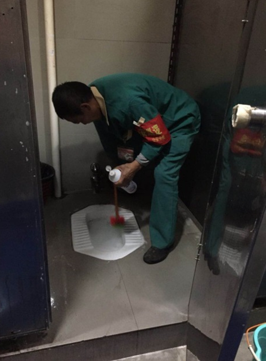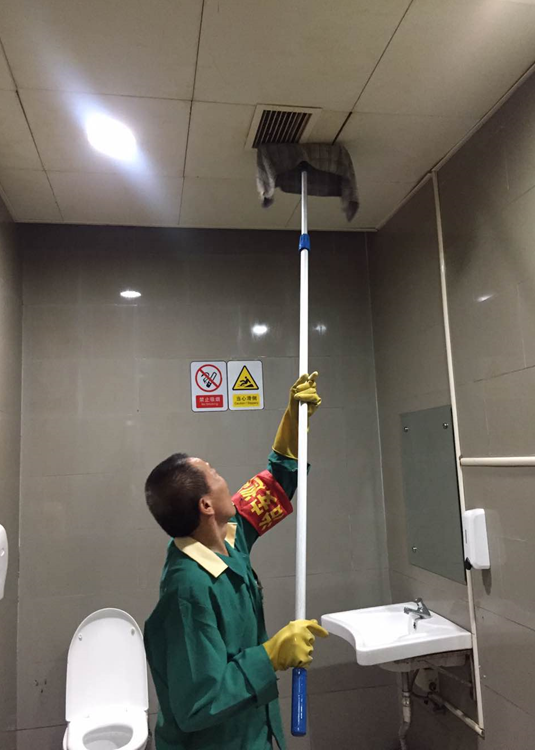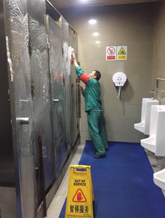 4.配置专人专岗,提高清洁水平。配置洗手间专人专岗固定值守,每天7点至23点的日常保洁时间:高峰时段男、女洗手间各配一名保洁员;平峰时段配置一名保洁员。23点至次日7点的夜间作业时间:洗地机清洗洗手间内地面,台面镜面清抹清刮,墙面隔板天花刷洗,大小便池彻底清洗并测试冲水设备情况。同时对洗手间清洁工具单独放置,避免交叉污染。