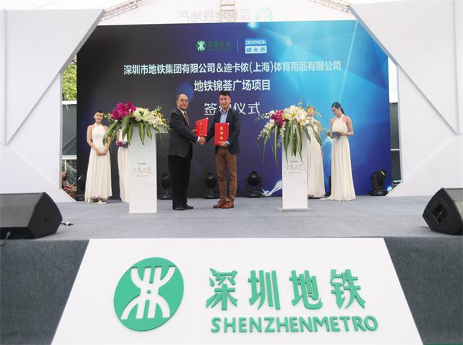 一阵热烈的掌声之后,发布会迎来重点环节——品牌商家签约,深圳地铁地产暨深圳地铁商管公司总经理张建华与迪卡侬(上海)体育用品有限公司华南大区发展总监殷珺,深圳市大生体育有限公司总经理高尚,洲际酒店集团中国南区、香港、澳门、台湾地区、大中华区营运副总裁韩锡辉一一受邀上台,一起见证深圳地铁商业品牌战略合作成果发布。这将意味着深圳地铁与迪卡侬、大生体育、洲际集团旗下英迪格酒店品牌达成战略合作,携手共进,助力深圳地铁商业的发展。