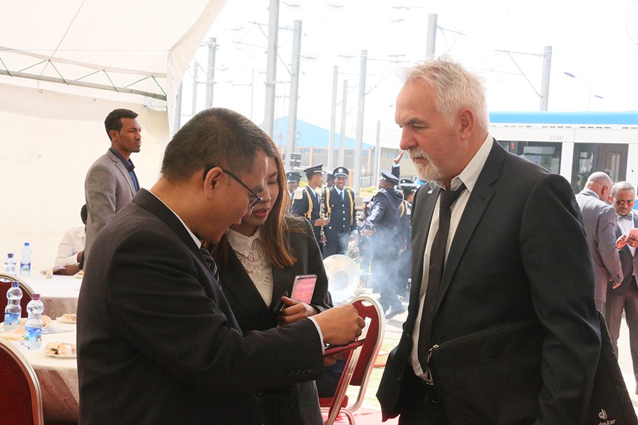 上午10点钟,伴随着埃塞国家军乐仪仗队澎湃激昂的奏曲,隆重的庆典仪式在kality维修楼前拉开帷幕,埃塞铁路公司总裁格塔丘贝特鲁首先开场致辞,他表示:“亚的斯亚贝巴轻轨改善了城市公共交通,轻轨系统到2030年预计实现碳减排量180万吨。今天,非常高兴亚的斯亚贝巴获得了2016年C40气候领导城市交通领袖奖,感谢深圳地铁和中国中铁为轻轨运营做出的努力。”