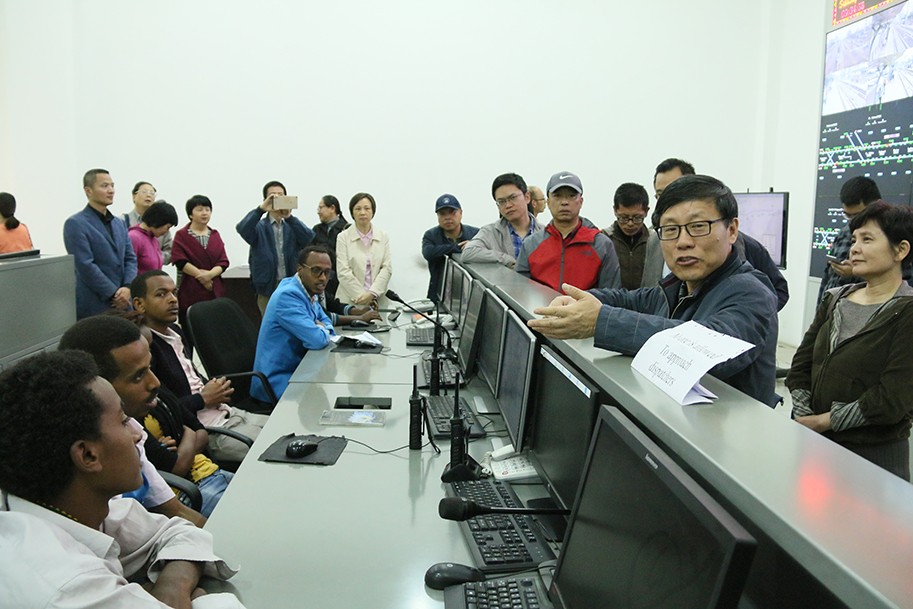 在OCC调度控制中心,参观团听取了埃塞轻轨项目运营各项工作的有关介绍,旷大使仔细询问了列车上线率、载客率、列车调度运作方法、中埃方培训交接情况等,现场的值班员工对各类问题进行了详细专业的回答,使参观团对轻轨各类工作有了更全面充分的认识。