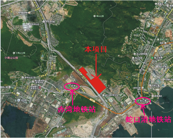 深圳地铁山海商业街项目位于龙瑞家园住宅区,西南临兴海大道,东南至松湖路,西北、东北侧为大南山,到赤湾地铁站直线距离约650米。项目商业面积5260㎡,为南北走向商业街布局。项目物业小区由政府保障性住房(3208套)、山海津住宅(858套)及山海韵住宅(338套)组成,项目成熟期总人口达一万多人。